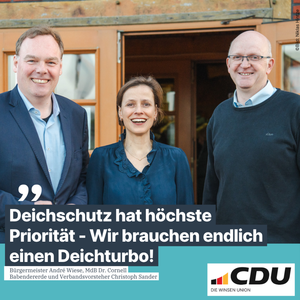 Für die tagtägliche Unterhaltung der bestehenden Deiche wünschte sich Sander Verständnis aus der Bevölkerung und ein angemessenes Verhalten auf und am Deich. Er verdeutlichte auch die entscheidende Bedeutung der Schafe für die Deichsicherheit. „Die Schafe bleiben unverzichtbare Mitarbeiter“ so Sander. Dies unterstrich auch die Winsener Bundestagsabgeordnete Cornell Babendererde vor dem Hintergrund verschiedener Wolfssichtungen und zum Teil schwerer Vorfälle in anderen Küstenregionen. „Hier sind die Rahmenbedingungen geschaffen, um Weidetiere wie Schafe endlich besser vor Wolfsübergriffen zu schützen. Entschlossenes Handeln der rot-grünen Landesregierung ist da überfällig.“ Sie machte ebenso wie Winsens Bürgermeister André Wiese deutlich, wie wichtig schnellere Verfahren sind. „Wir brauchen einen Deichturbo, der endlich das Thema Sicherheit für Mensch und Natur hinter den Deichen klar priorisiert gegenüber anderen Rechtsbelangen.“ Wiese verwies für die Situation in der Stadt Winsen (Luhe) auch auf die gute Zusammenarbeit der Deichverbände untereinander, denn die Grenzen sind fließend. Ein erheblicher Teil der Kreisstadt liegt auch im Verbandsgebiet des Artlenburger Deichverbandes. André Wiese: „Dieser Zusammenhalt der Verbände mit den Gemeinden und Kreisen vor Ort ist von sehr hoher Bedeutung, um unsere Interessen sichtbar zu machen. Alle Menschen in unserer Stadt können dankbar sein, dass sich in den Deichverbänden so viele Menschen tagtäglich mit Herzblut und Sachverstand für unsere Sicherheit engagieren.“